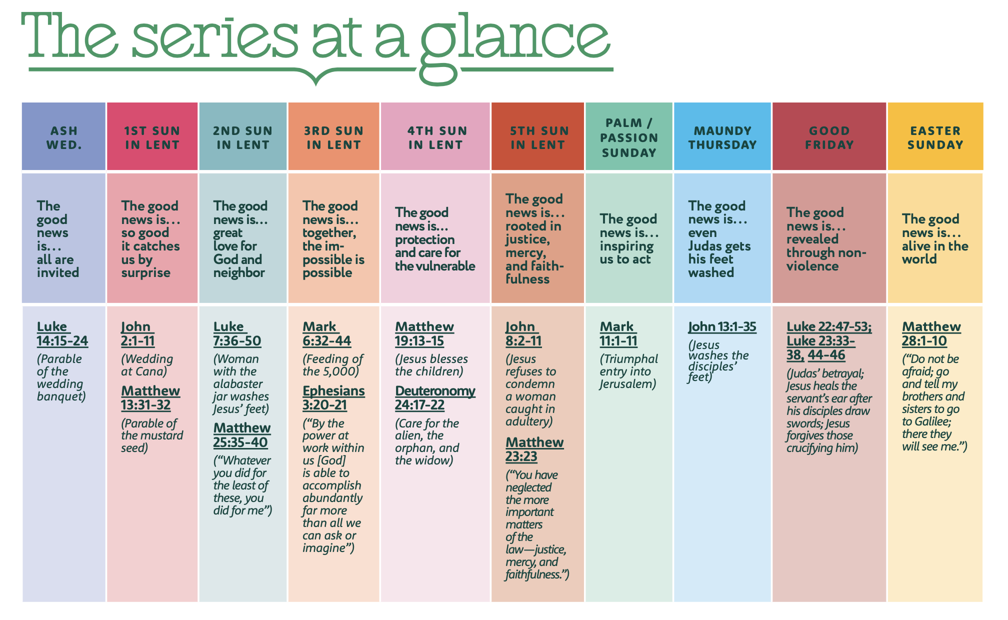 The good news is alive, surprising, and abundant, inviting us into a richer life. This Lent, may these teachings inspire meaningful worship, conversation, and faithful action in a world longing for hope. Here is the series at a glance: